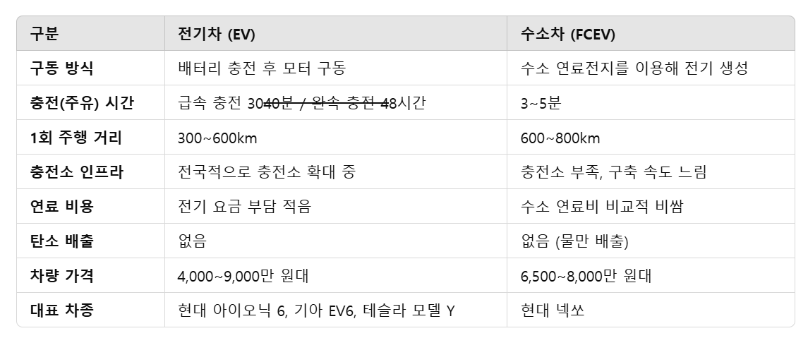 이번 글에서는 전기차와 수소차의 개념적인 차이, 장단점, 국내 시장 비교, 추천 대상 등을 상세히 정리했습니다.